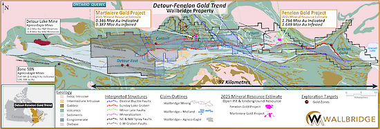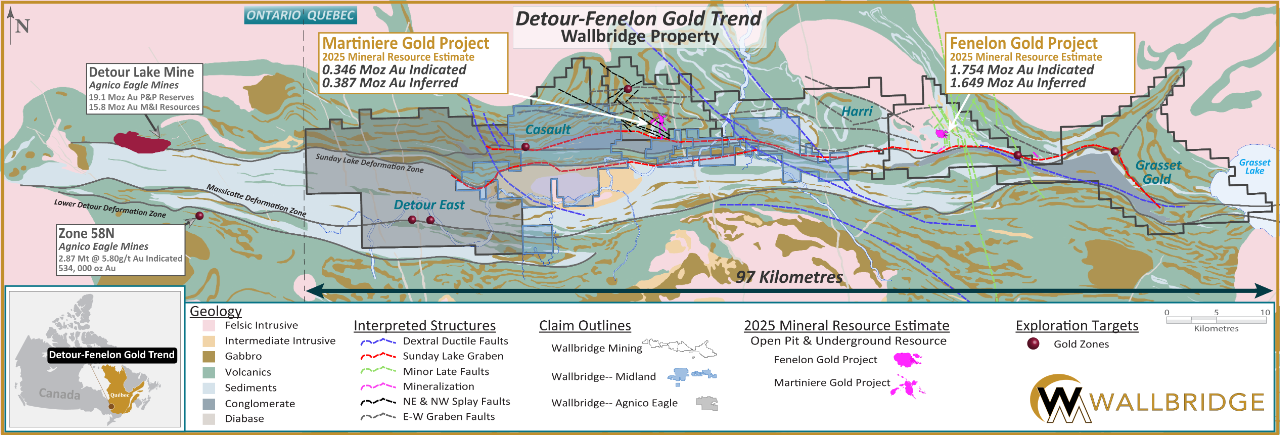 Wallbridge is focused on creating value through the exploration and sustainable development of gold projects in Quebec’s Abitibi region while respecting the environment and communities where it operates. The Company holds a contiguous mineral property position totaling 830 km2 that extends approximately 97 km along the Detour-Fenelon gold trend. The property is host to the Company’s flagship PEA stage Fenelon Gold Project, and its earlier exploration stage Martiniere Gold Project, as well as numerous other gold exploration targets.